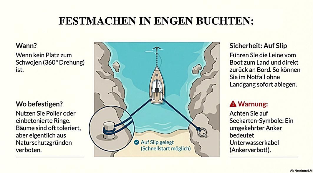 Gut überlegen sollte man sich dabei, woran man sich an Land festhält – bestens geeignet dazu sind natürlich Poller oder etwa Metallringe, die in Felsen einbetoniert wurden (beides findet man ab und zu auch in Buchten). Ganz schlecht hingegen sind Felsen direkt, da durch die scharfen Kanten des Steins die Leinen freilich sehr schnell durchgescheuert sind.